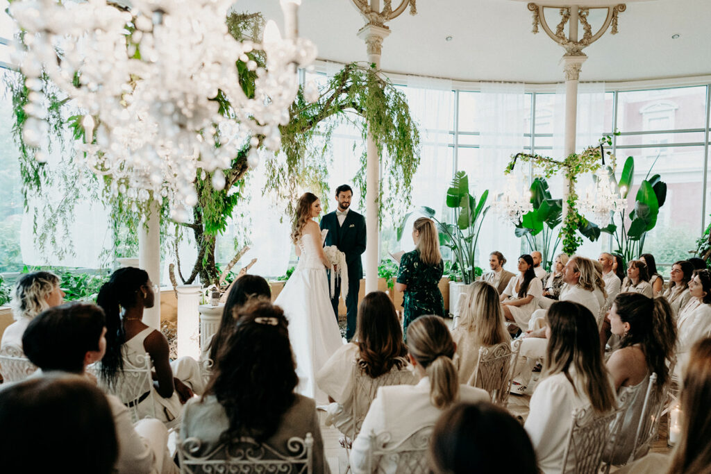 Dans l’écrin prestigieux de l’hôtel du Palais de Biarritz, une scénographie d’exception réinvente la cérémonie laïque. Un décor où l’élégance architecturale se mêle à une végétation luxuriante, créant un équilibre subtil entre sophistication et nature.